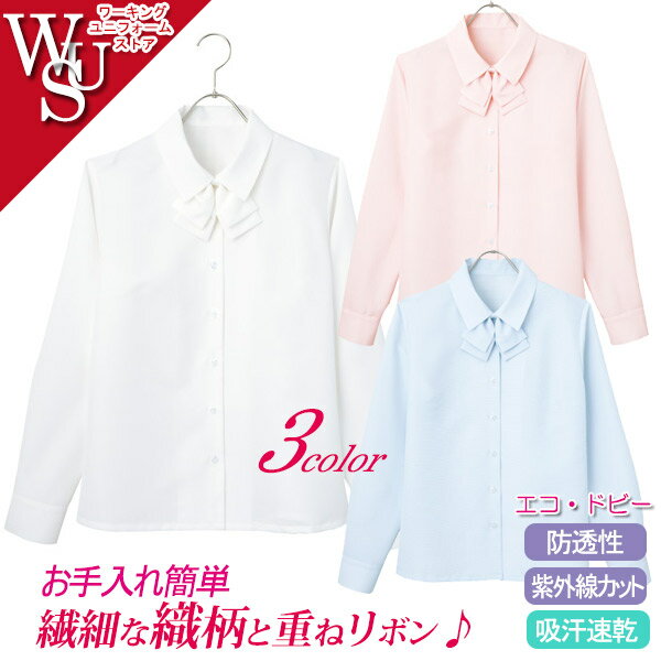 事務服リボンブラウス 長袖 EWB386 エンジョイ ソフトカルゼストレッチ