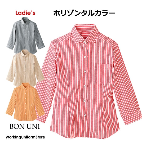 飲食店 レディース シャツ七分袖 4色 24211 ストライプ ボンユニ